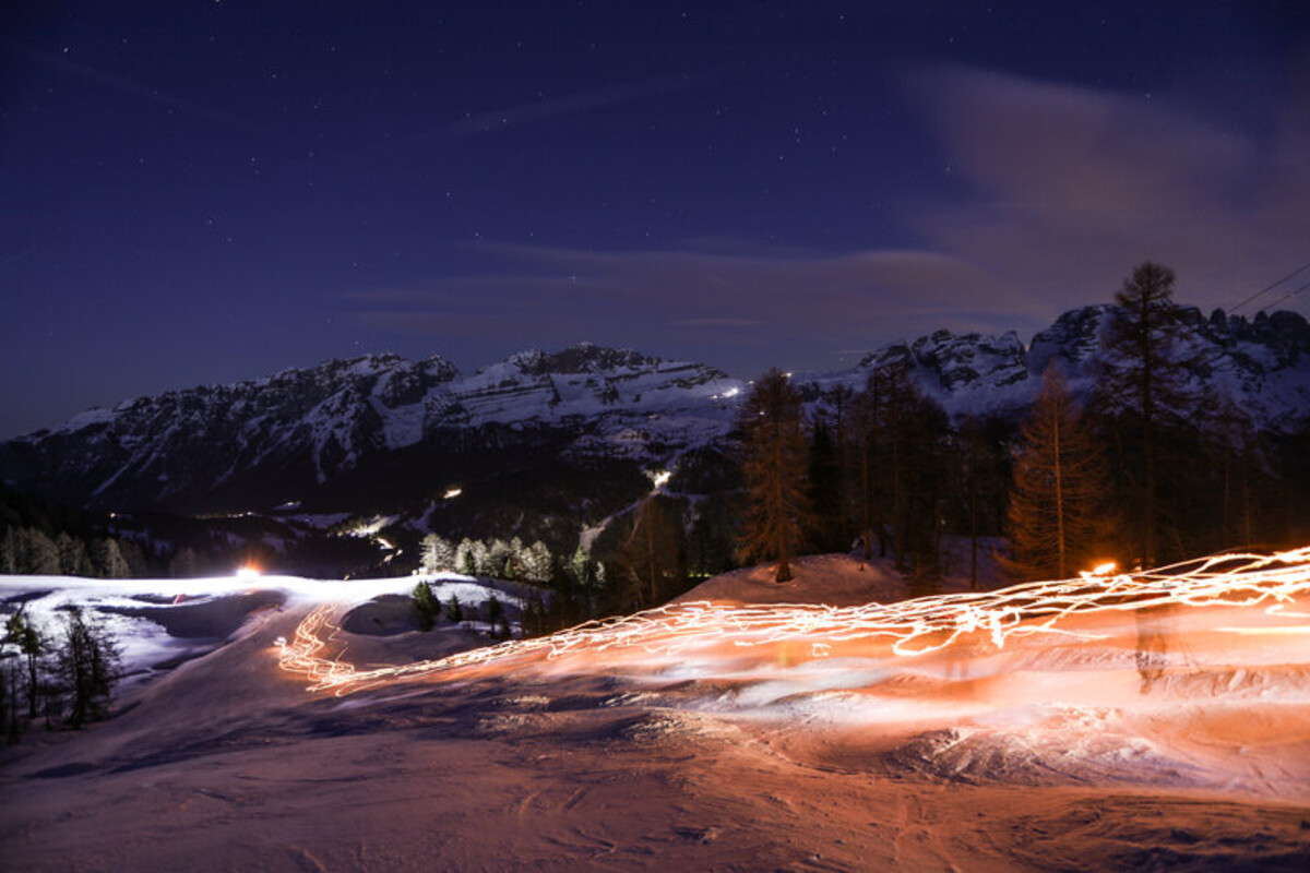 Im Skigebiet Campiglio Dolomiti di Brenta ist der Tag auf der Piste nie zu Ende. Steigen Sie in die Gondel für eine besondere Fahrt bei der Schließung der Lifte, genießen Sie das Schauspiel der Brenta-Dolomiten und der Adamello-Presanella bei Sonnenuntergang, während Sie leckere Fingerfoods während eines Aperitifs auf der Terrasse der schönsten Hütten genießen, und fahren Sie mit den Skiern an den Füßen und der Fackel in der Hand in Begleitung der Skilehrer ab.