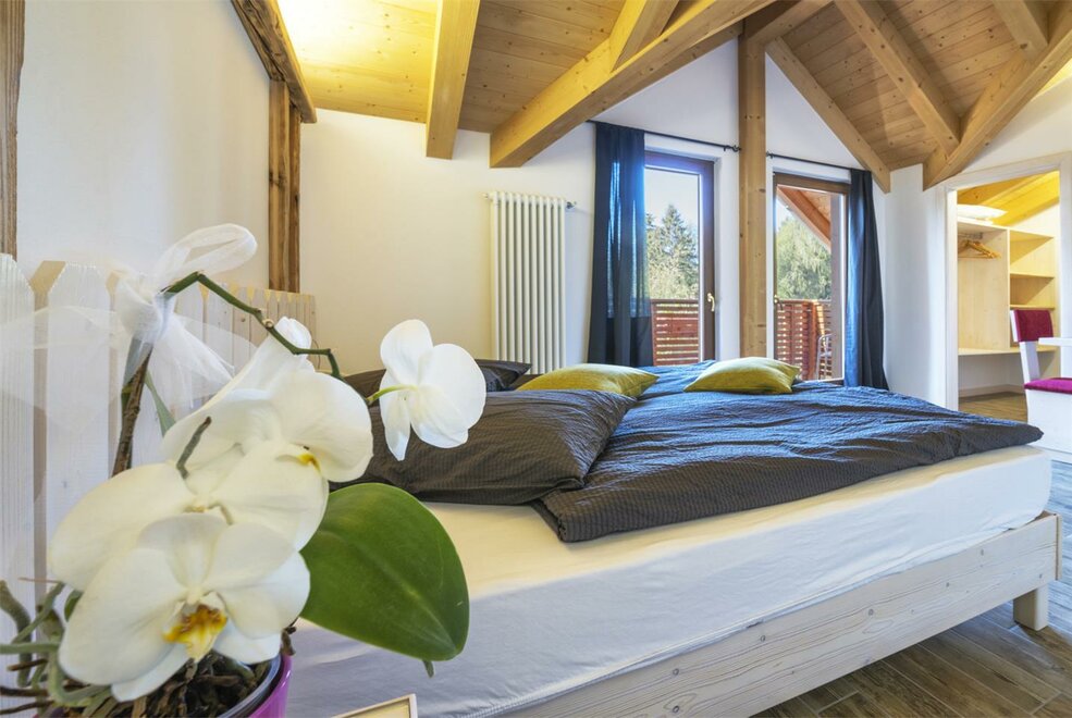 Superior attic room with a view of the Brenta Dolomites for a wonderful awakening. Free access to the wellness terrace with a bottle of sparkling wine upon your arrival in the room for a sweet toast for two. HD LED TV and a desk with designer chairs. Balcony and walk-in closet for added comfort. On request, also available with 3 beds.