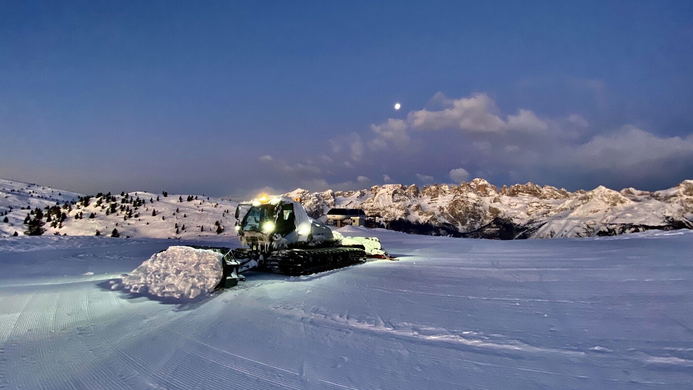 Al calare del sole, quando gli impianti di risalita si fermano, sulle piste entrano in azione i gatti delle nevi per garantirti piste perfettamente battute il giorno dopo.