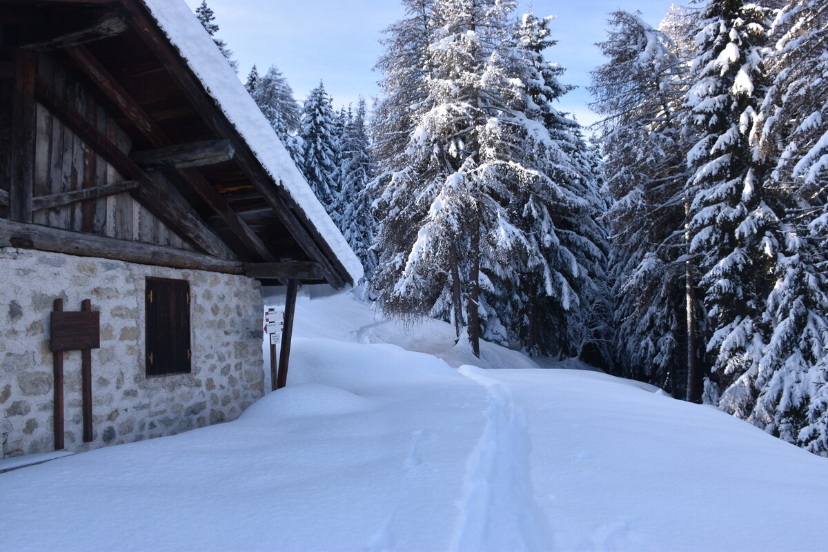 Tranquilla passeggiata che si sviluppa nella tranquillità e nel silenzio del bosco fino al malghetto di Almazzago, un terrazzo panoramico naturale con una spettacolare vista sulla Val di Sole.