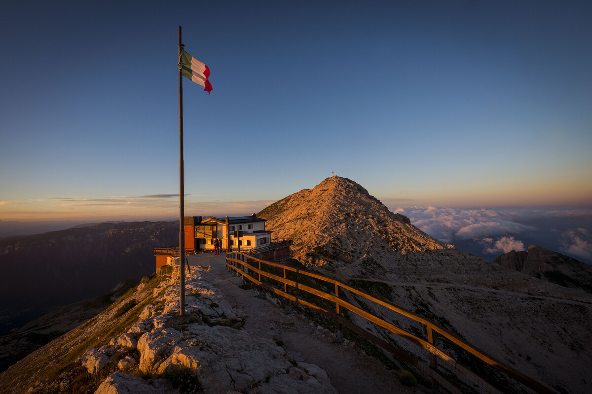 Quinta tappa. Dalla cima dello Zugna una selvaggia dorsale che sembra infinita, ricca di grandi panorami, si allunga in direzione sud est fino alle Piccole Dolomiti e il Gruppo del Carega, toccando Passo Buole, “Termopili d’Italia”, per le battaglie che nel 1916 fermarono i tentativi di sfondare la prima linea italiana. La meta è il rifugio Fraccaroli ai piedi di Cima Carega al confine con la Lessinia orientale.