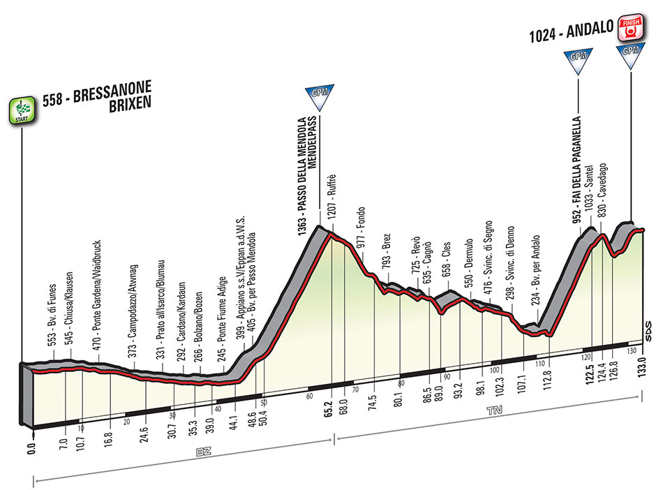 Martedì 24 maggio, a 43 anni di distanza dal successo di Eddy Merckx sul traguardo di Andalo, sarà nuovamente l’Altopiano della Paganella, all’ombra delle Dolomiti di Brenta, il teatro dei chilometri conclusivi della tappa. Una frazione breve, di appena 132 km, ma caratterizzata da lunghe salite e insidiose discese, con partenza fissata a Bressanone. Momento clou sarà l’ascesa che porterà i corridori al gran premio della montagna di Fai della Paganella, con un tratto particolarmente impegnativo che sfiorerà il 15% di pendenza.