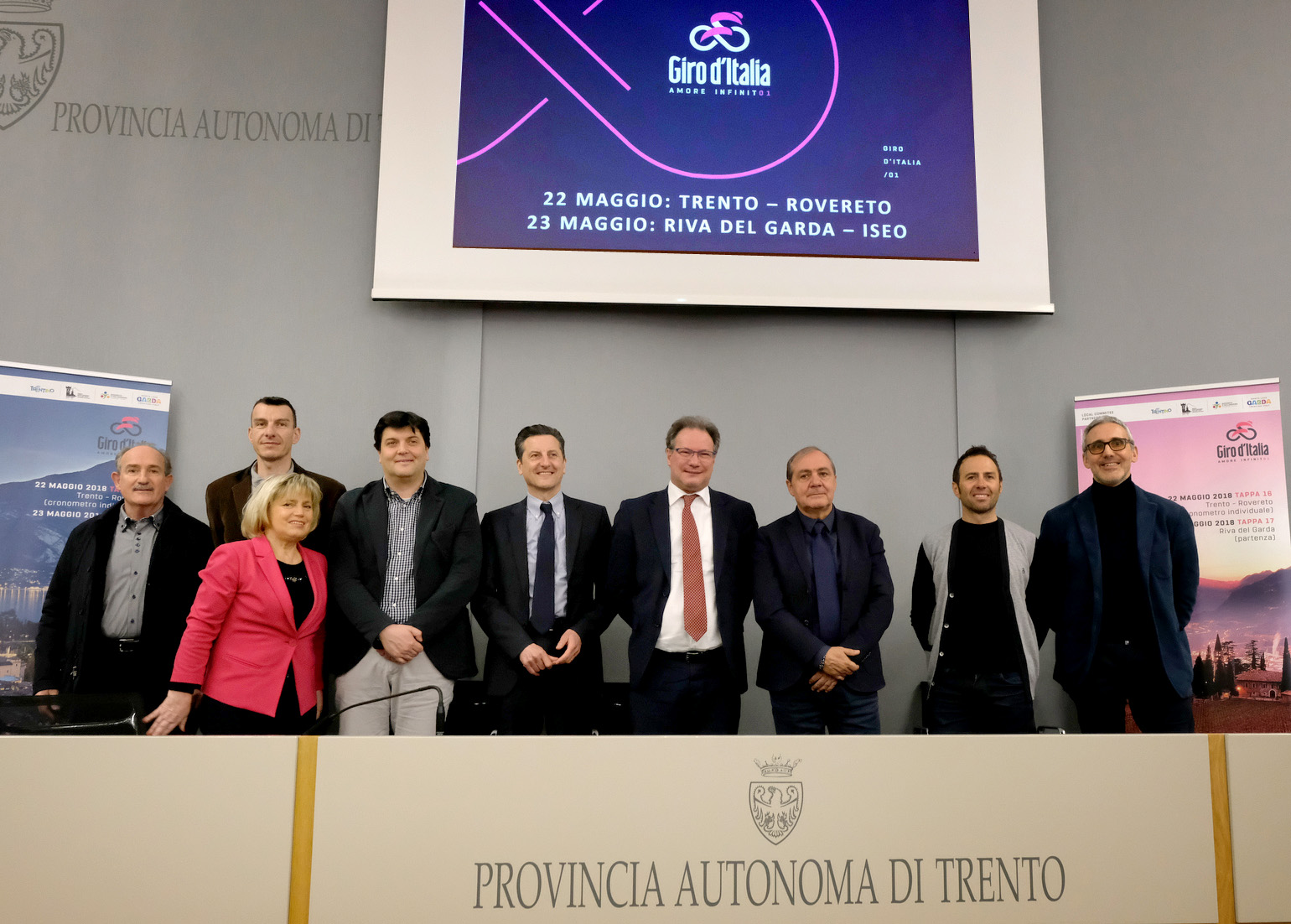 Il 101° Giro d'Italia in Trentino è stato presentato oggi a Trento dal direttore Mauro Vegni insieme all'assessore provinciale al turismo e promozione Michele Dallapiccola, il CEO di Trentino Marketing Maurizio Rossini, i sindaci di Trento Alessandro Andreatta e di Rovereto Francesco Valduga, l'assessore ai lavori pubblici del Comune di Riva del Garda Alessio Zanoni, il campione Gilberto Simoni, vincitore di due edizioni della gara rosa ed i rappresentanti delle Apt di Trento - Monte Bondone e Rovereto - Vallagarina.