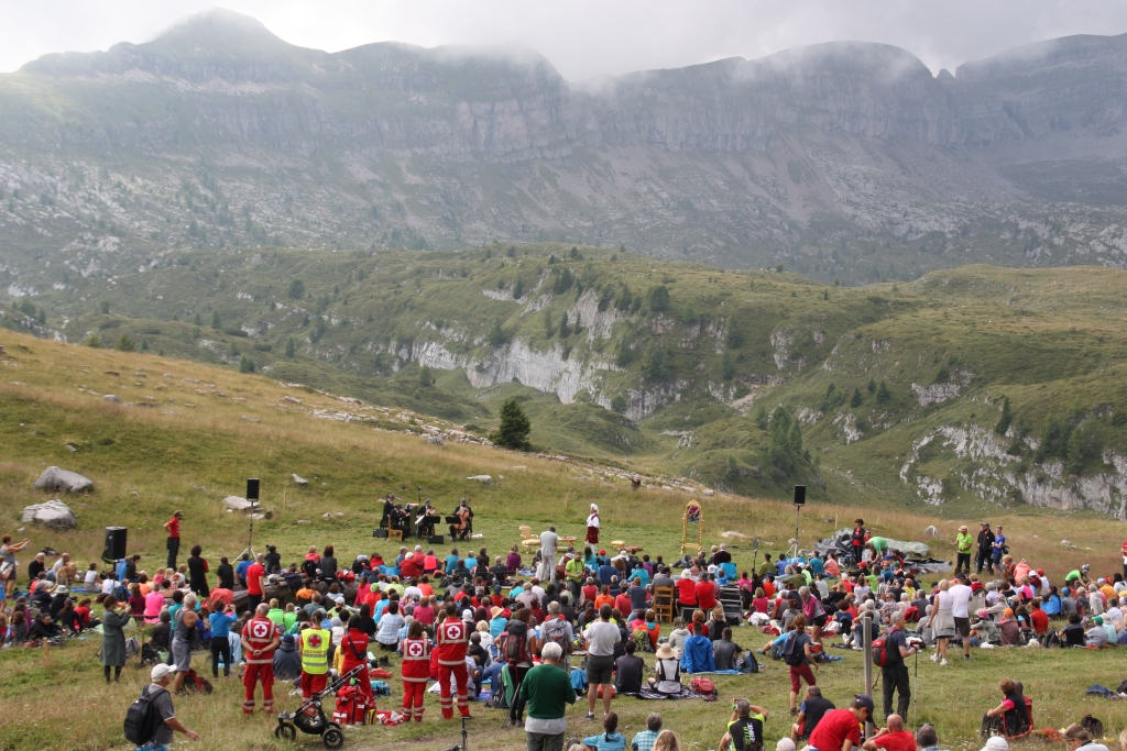 È finita con una festa gioiosa a base di applausi e canti la prima assoluta di un'opera a duemila metri di quota che il festival trentino I Suoni delle Dolomiti ha portato oggi, 31 agosto, nello straordinario scenario del Pian della Nana nelle Dolomiti di Brenta in val di Non.