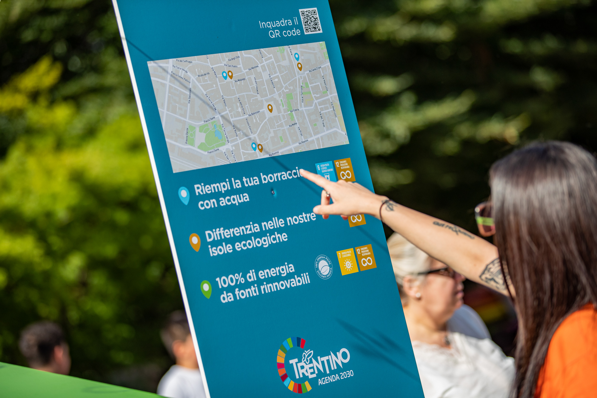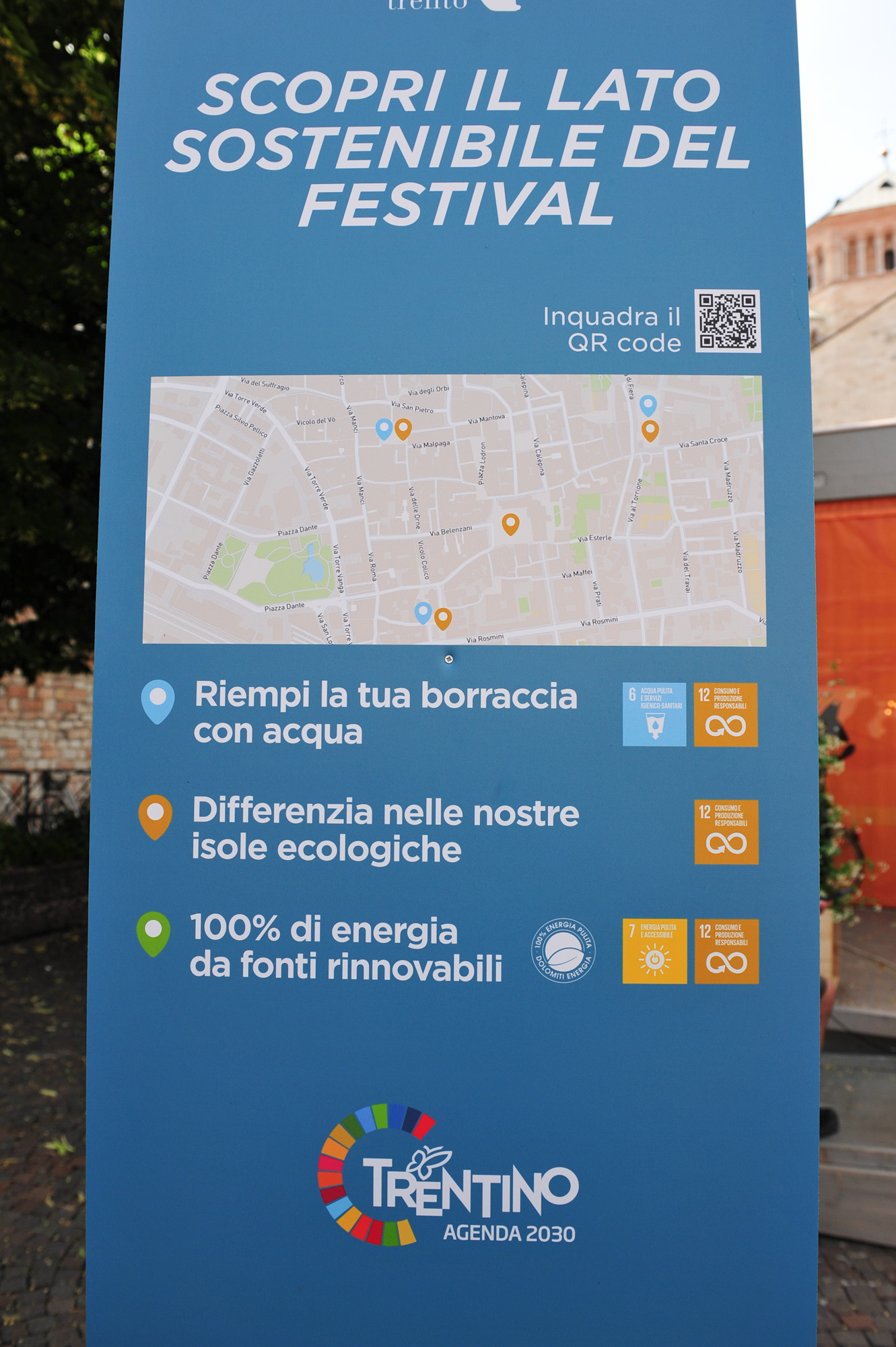 Fra le best practice introdotte sono state considerate l’installazione di erogatori d’acqua e di isole ecologiche nelle piazze di Trento, la messa a disposizione di informazioni e mezzi per favorire la mobilità alternativa, l’utilizzo di energia rinnovabile (attestata dal certificato 100% energia pulita di Dolomiti Energia), la scelta di gadget provenienti da economia sociale e che favorisce l’economia circolare e il consumo responsabile, l’attenzione al riciclo degli allestimenti e all’accessibilità valorizzata attraverso la realizzazione di schede tecniche informative.
