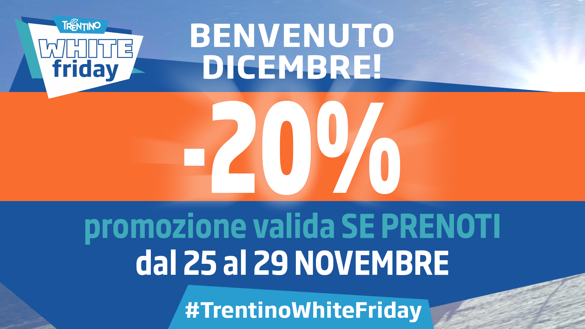 Oltre alle campagne pubblicitarie già in corso per promuovere l’inverno trentino in tutta Europa, in occasione dell’apertura della stagione invernale, Trentino Marketing vuole in questo modo rinforzare la visibilità del nostro territorio a livello italiano, giocando un po’ con le parole: il nostro Black Friday diventa così “White Friday”, il colore della natura in inverno, delle piste da sci, del wellness, dello stare bene.
